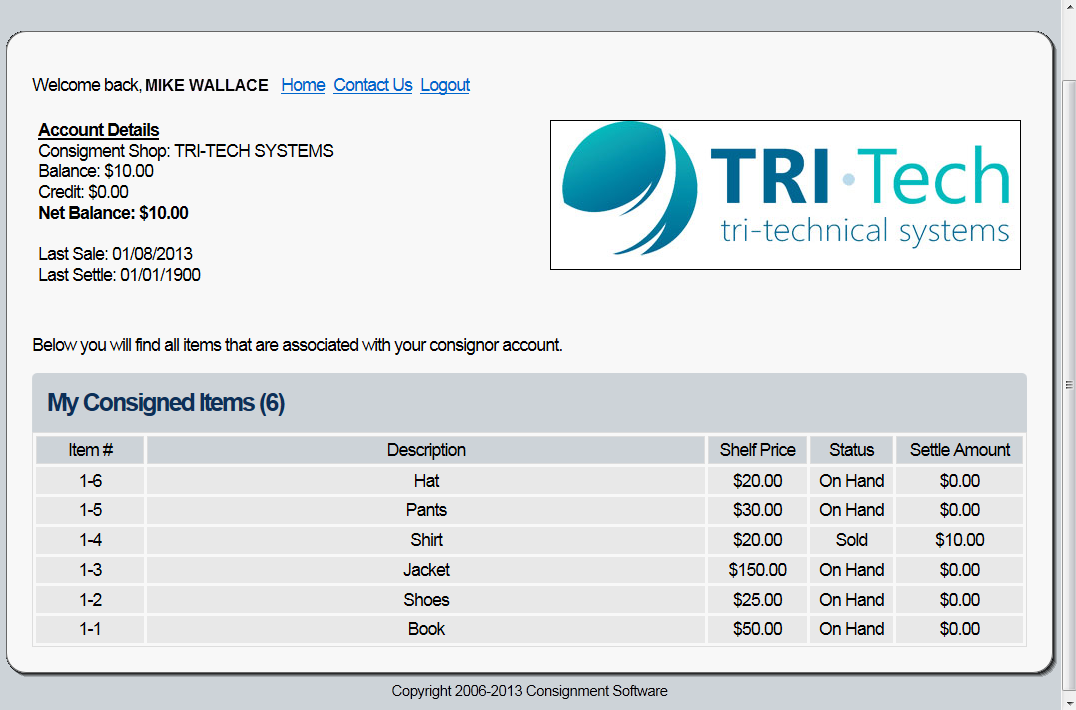 - Click Login. Your user page displays and lists the items you have consigned and your store balance. The following image represents this page.