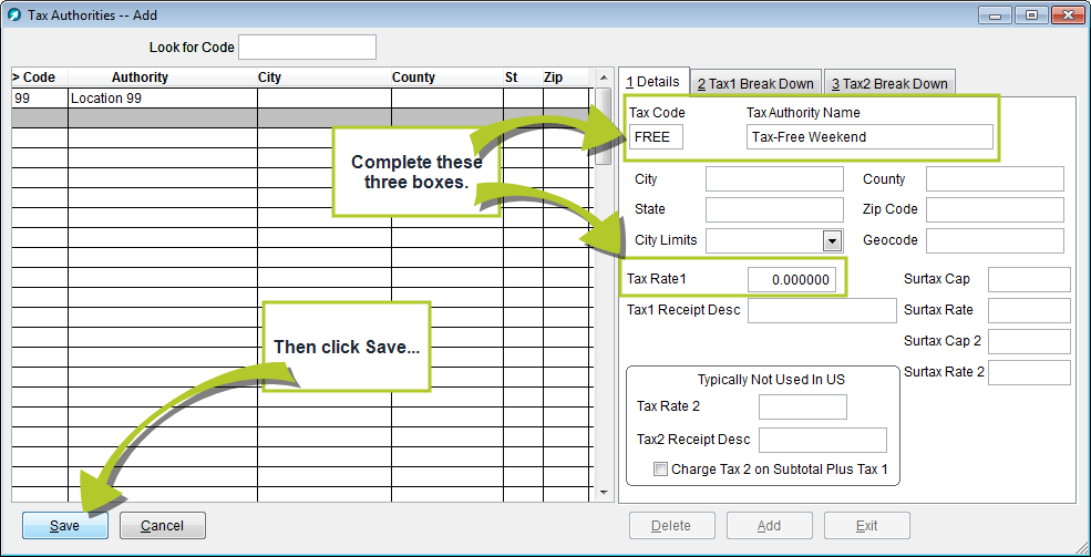 - Enter a Tax Code (up to 5 alpha-numeric characters) for your new tax-free tax authority, such as FREE.