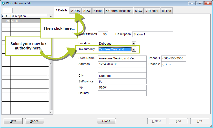 Caution: Remember to reset the tax authority on each workstation after tax free weekend.