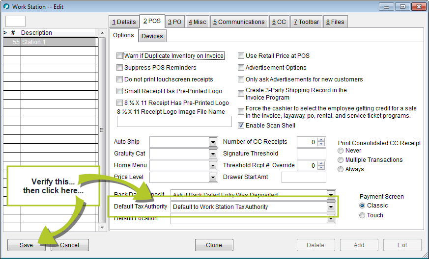 - On the POS tab, verify that the Default Tax Authority is set to Default to Work Station Tax Authority.